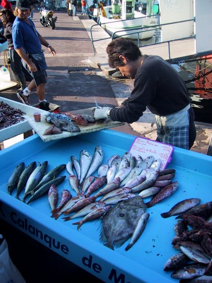 In Jocelyn's report she comments on fishing in the Mediterranean and the fish market she saw in Marseille. Every day at the head of the quay in the Vieux Port in Marseille there is a fish market. There are dozens of stalls all selling fresh fish, which we assume is all caught nearby in the Mediterranean. Given how many people live around the Mediterranean and how long it has been fished, we are amazed at the variety and abundance of the fish. Some of this is just because we are unfamiliar with many of the fish, but the fishmongers at the Granville Island Market in Vancouver will never quite look the same to us again.