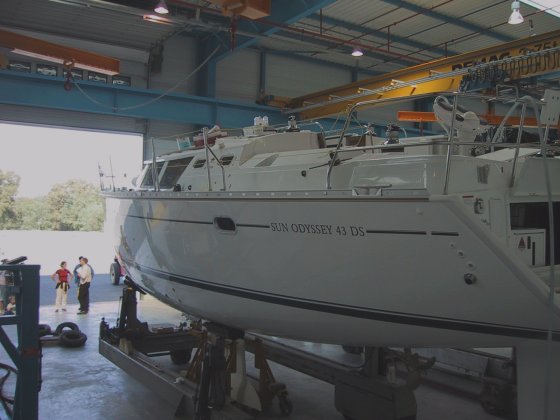 In April 2001, Jeanneau opened a new state-of-the-art factory. Dragonsinger is being built in this factory. There are three separate buildings. The first is where the hull and deck are laid up in molds. The deck is actually made in two parts -- an outer and inner layer, which must be bonded together. A separate building is used to lay on teak decks (which we did not order).