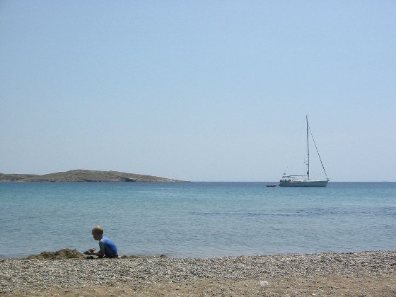 After lunch I have a nap while the boys play. They do some swimming, then Allen starts making a sand castle on the beach. I sit up and enjoy the view of the bay spread out behind Allen as he keeps busy with his project.