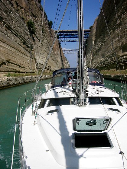 The Corinth Canal separates the Peloponnese from mainland Greece. A canal between the Aegean and Ionian Seas had been considered since 67 AD, but a canal was not completed until the 19C. We transited the canal from west to east one morning in May. Traffic is restricted to one direction only and pilot boats give specific instructions for when to enter the canal and what boat to follow. Steady hands on the wheel are needed to drive straight between the tall cliffs that rise up from sea level and tower over the boats transiting the canal.